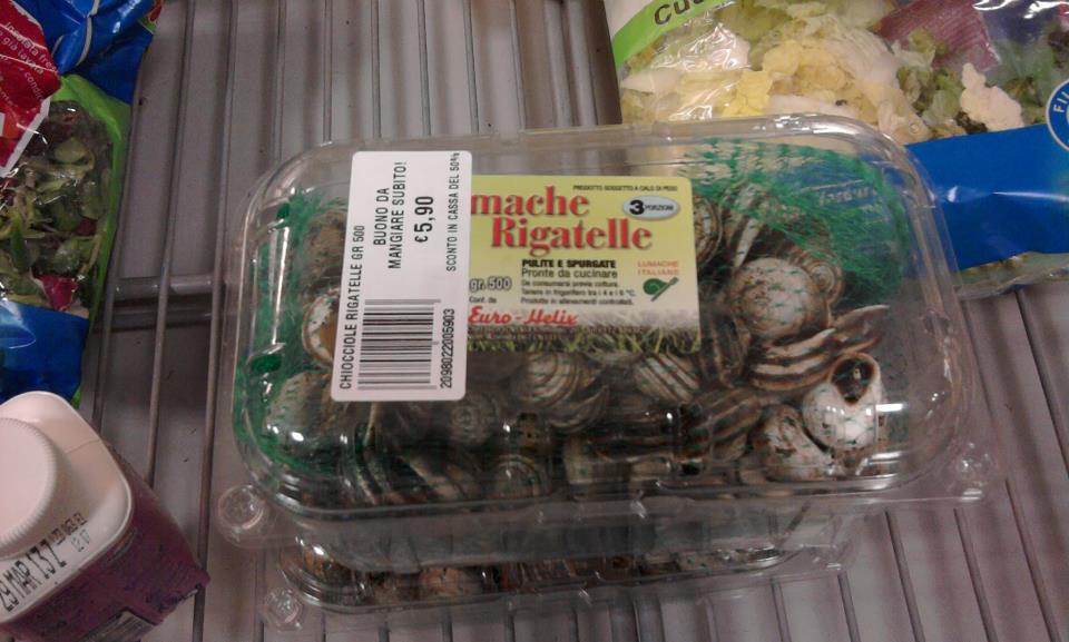 Mi affaccio e noto, tra le buste d’insalata e confezioni di formaggio con scadenza quel giorno stesso, due contenitori di plastica trasparente con all’interno decine e decine di chiocciole insacchettate in una rete verde.