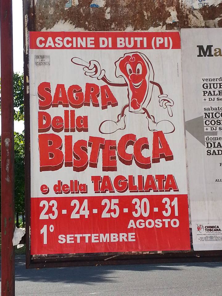 Pubblicità danzante per la Sagra della Bistecca di Cascine di Buti, in provincia di Pisa. Per invitare la folla a mangiar bistecca hanno pensato di raffigurarne una con occhi , gambe (pure le scarpe!) e mani..