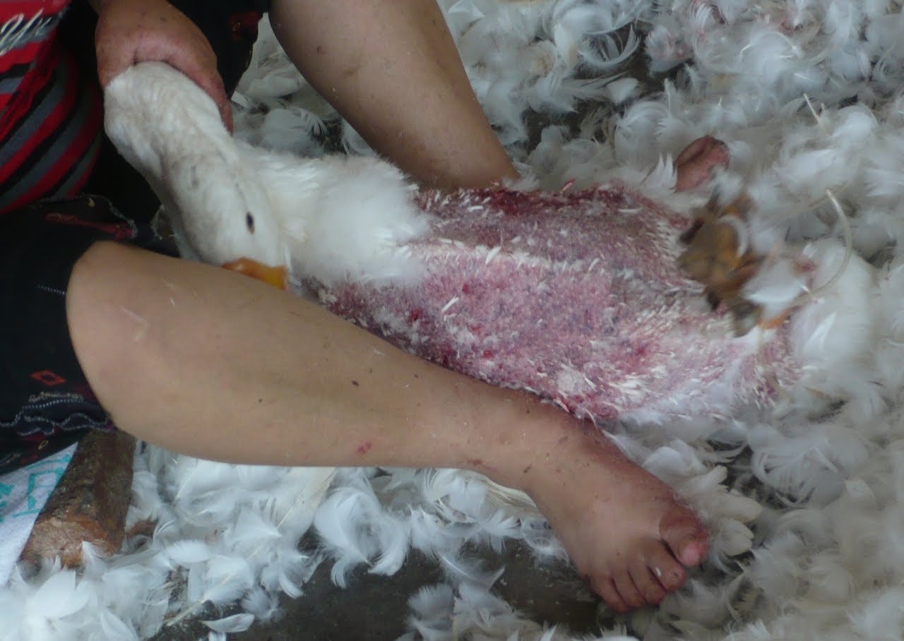 Gli operai ( spesso persone che vivono all’Est scelte per il costo minore della manodopera ) tengono gli animali fermi con le zampe legate in modo che non possano scappare e iniziano a strappare dalla loro pelle le piume.