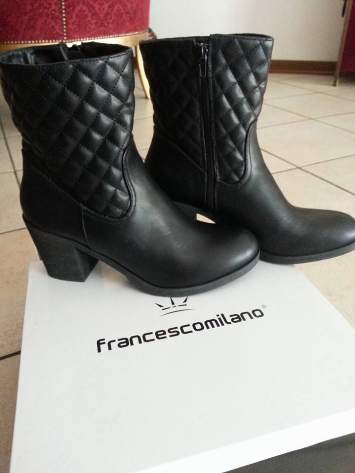 Comodissimi e caldi grazie all’interno in velluto.Un mio recente acquisto è stato un modello di stivaletti firmati Francesco Milano. Sono in similpelle neri, con tacco largo e zip laterale. Di questo marchio ho già un paio di ballerine elegantissime, così quando li ho visti su Zalando in offerta mi sono affrettata a comprarli.