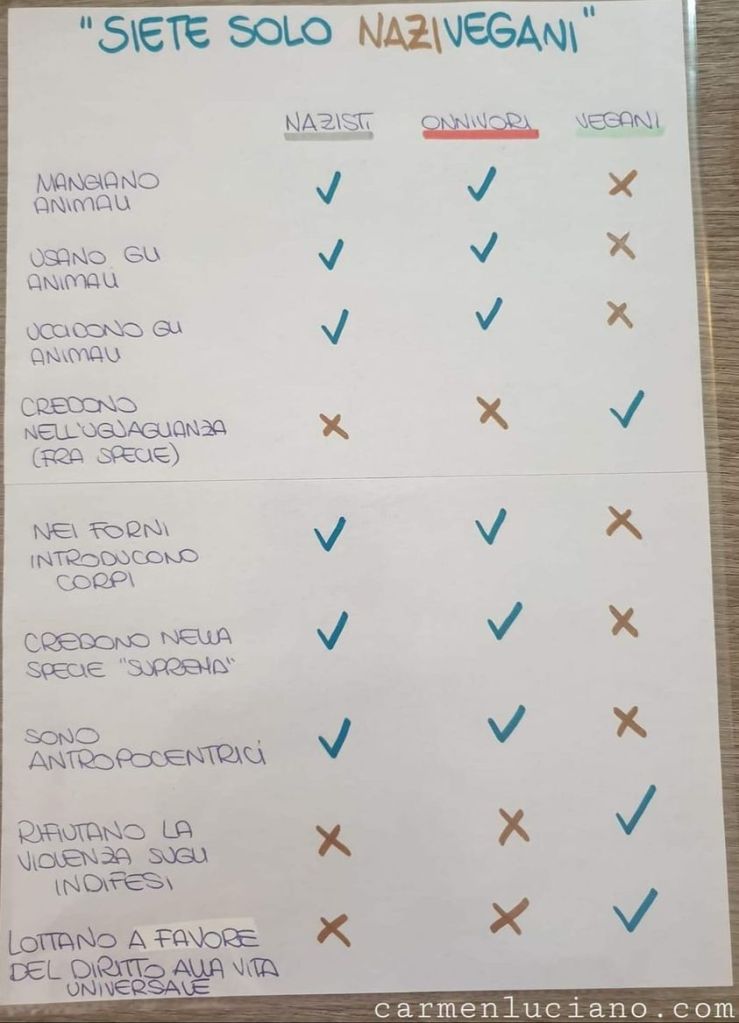 Riguardo alle accuse di essere “nazivegan”, ho trovato necessario fare uno schema per mostrare uguaglianze e parallelismi fra coloro che mangiano animali, chi non li mangia, e chi era realmente nazista.