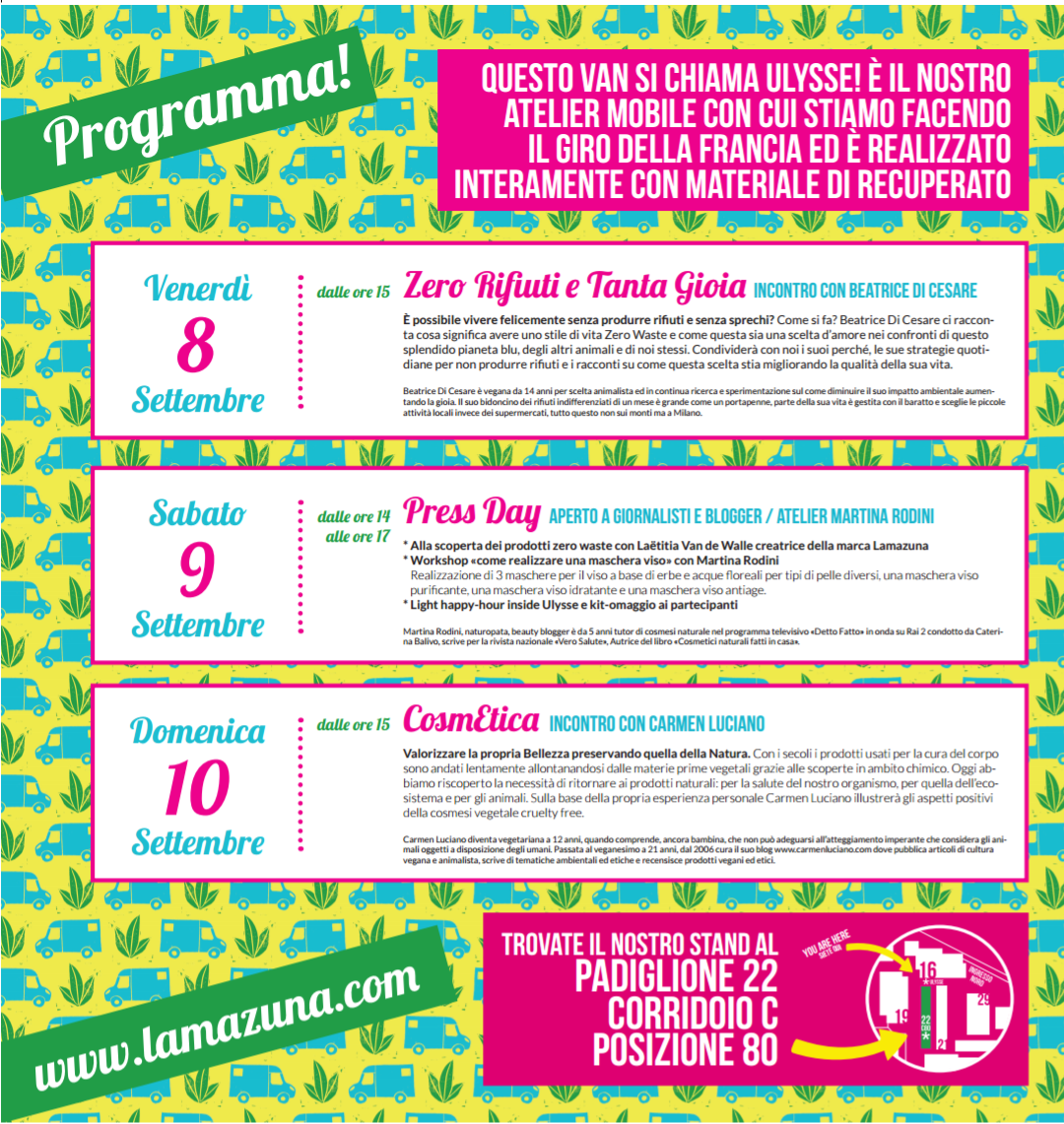 Domenica 10 Settembre 2017 alle ore 15.00 vi aspetto al Sana di Bologna per un incotro sulla CosmEtica. L’appuntamento si terrà in collaborazione con l’azienda zero waste francese Lamazuna, presente in fiera con i suoi prodotti a bordo del van Ulysses (super riciclato!), e con Pompea Gualano.