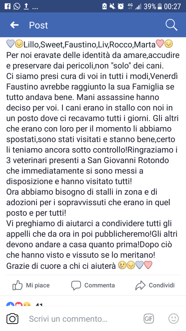 Solidarietà a questi animalisti che da soli stanno affrontando questa bruttissima situazione e un augurio che l’assassino possa presto subire conseguenze negative per l’uccisione compiuta.