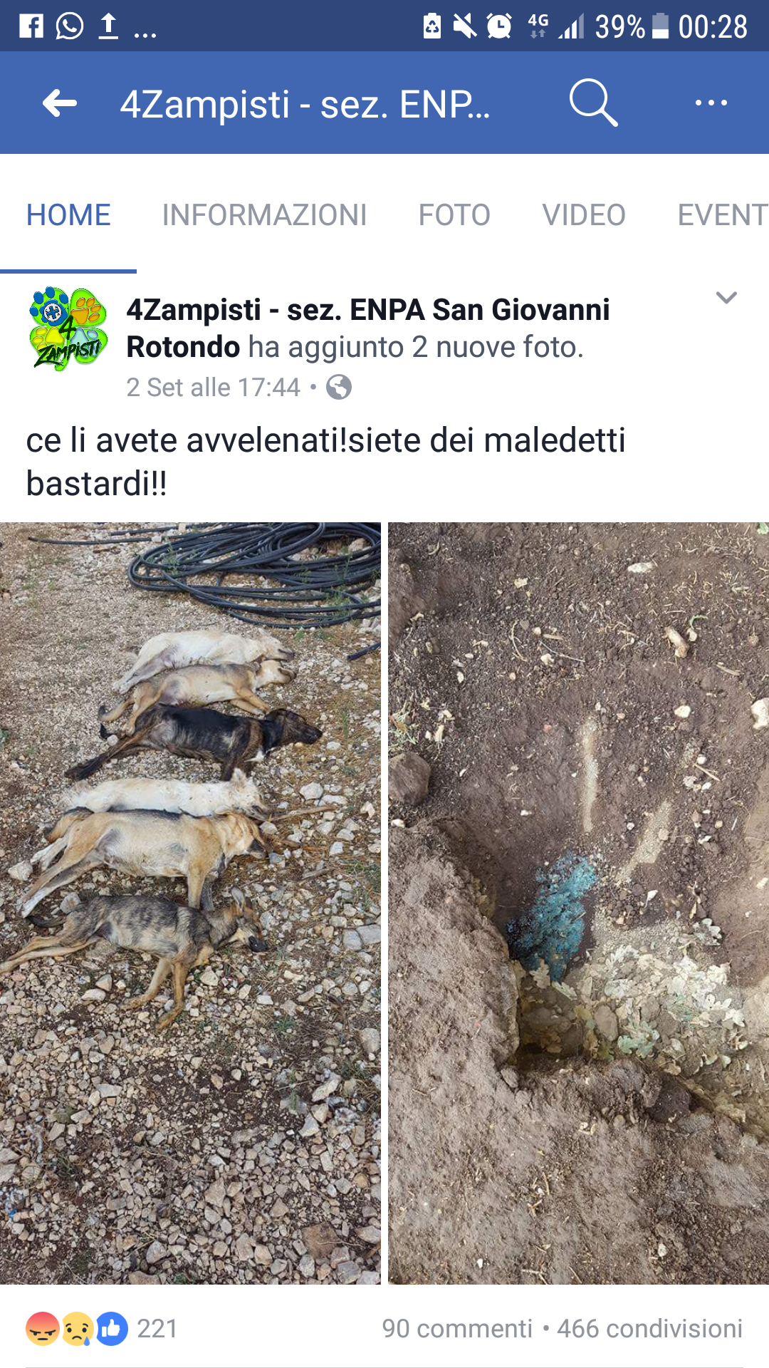 Dopo l’uccisione dei sei cani Enpa sezione San Giovanni Rotondo sta cercando stalli per i cuccioli in zone diverse per evitare che possa accadere la stessa cosa ad altri di loro. Il mostro assassino infatti non ha ancora un’identità .