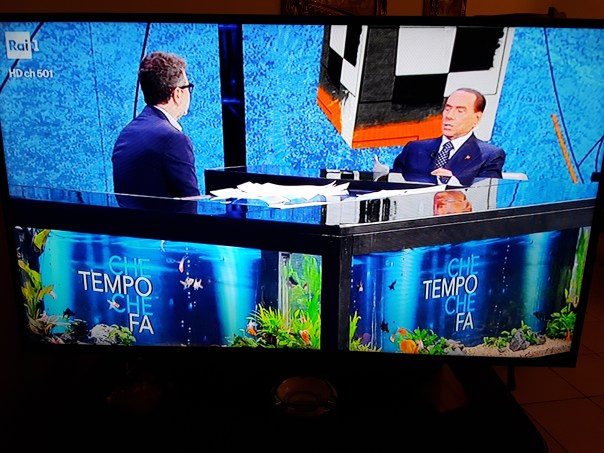 Seduti l’uno davanti all’altro, con le mani appoggiate al tavolo dello studio. Tutto potenzialmente molto bello, se non fosse per le decine di pesci tolti dal loro habitat (o comunque privati della loro libertà) intenti a nuotare come decori viventi nella vasca che fa da tavolo. E se non fosse per i capelli posticci di Silvio, dimenticavo.