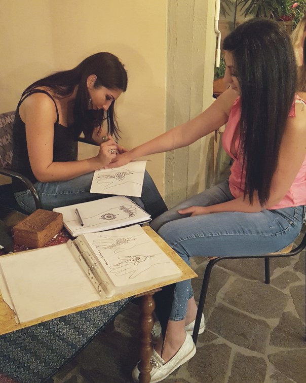 Felicissima di provare per la prima volta l’henné, dopo aver ordinato cosa desideravo assaggiare, mi sono diretta al divanetto per scegliere la mia decorazione.