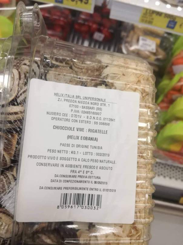 Oggi pomeriggio una persona, recandosi in un punto vendita della catena di supermercati Eurospin, nel banco frigo ha notato un “prodotto” insolito: in mezzo a confezioni di lupini sotto sale e ortaggi vari erano piazzate vaschette contenenti lumache vive.