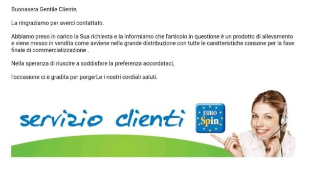 Eurospin ha risposto alle email con il seguente messaggio