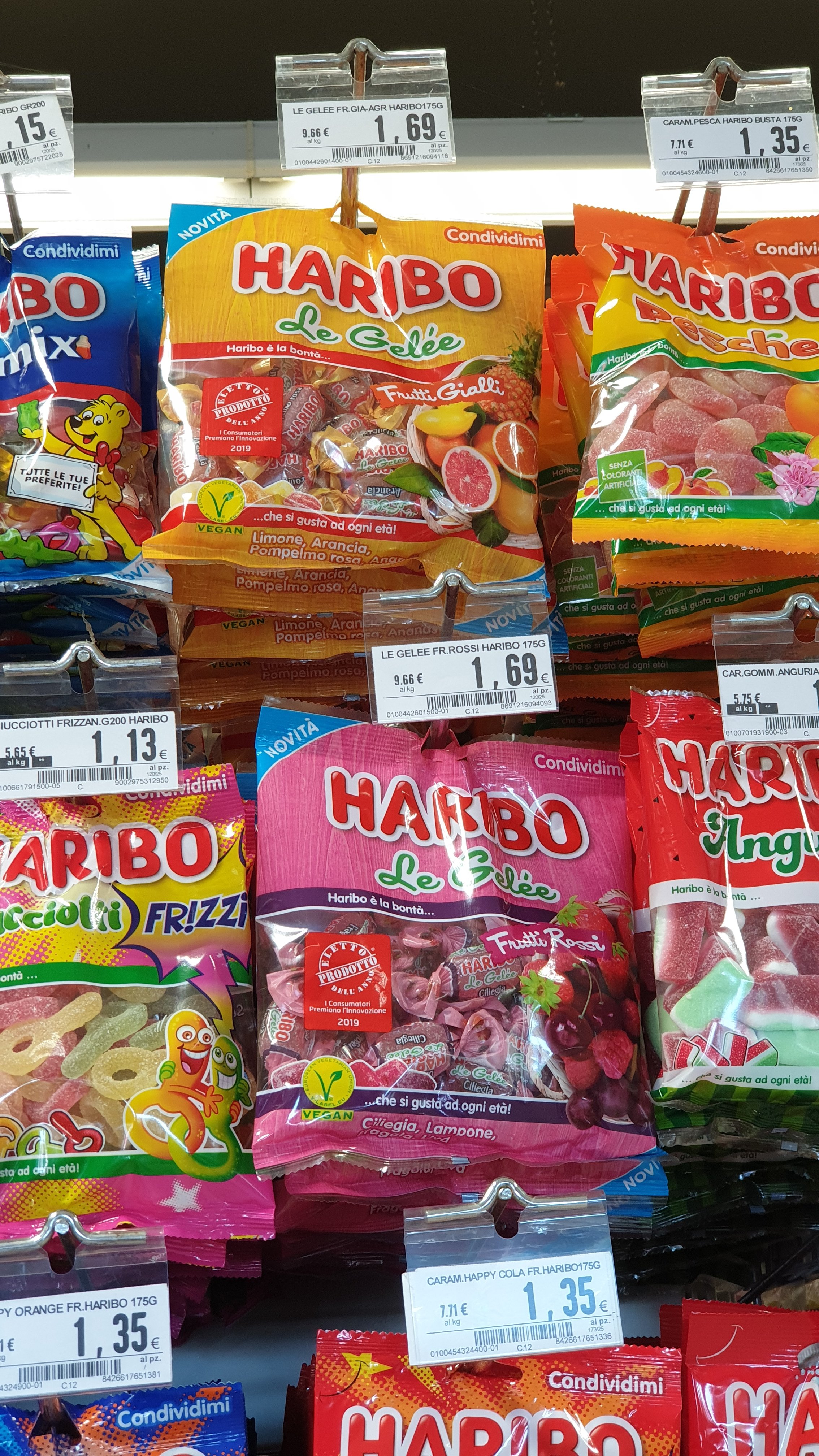 Stamattina mentre passavo dalla corsia dedicata a dolci e caramelle ho notato la scritta VEGAN proprio su una confezione di caramelle HARIBO.
