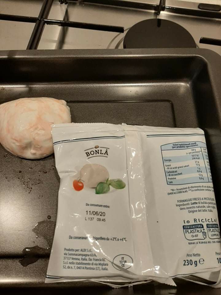 Martina mi ha spiegato che il ragazzo aveva deciso di consumare la mozzarella il giorno prima della scadenza riportata sull’involucro (indicata per l’11 giugno 2020). Di regola un alimento ben conservato il giorno prima della data di scadenza non dovrebbe avere inferiore qualità. Entrambi sono rimasti quindi sbalorditi dal vedere l’alimento di quel colore così strano.