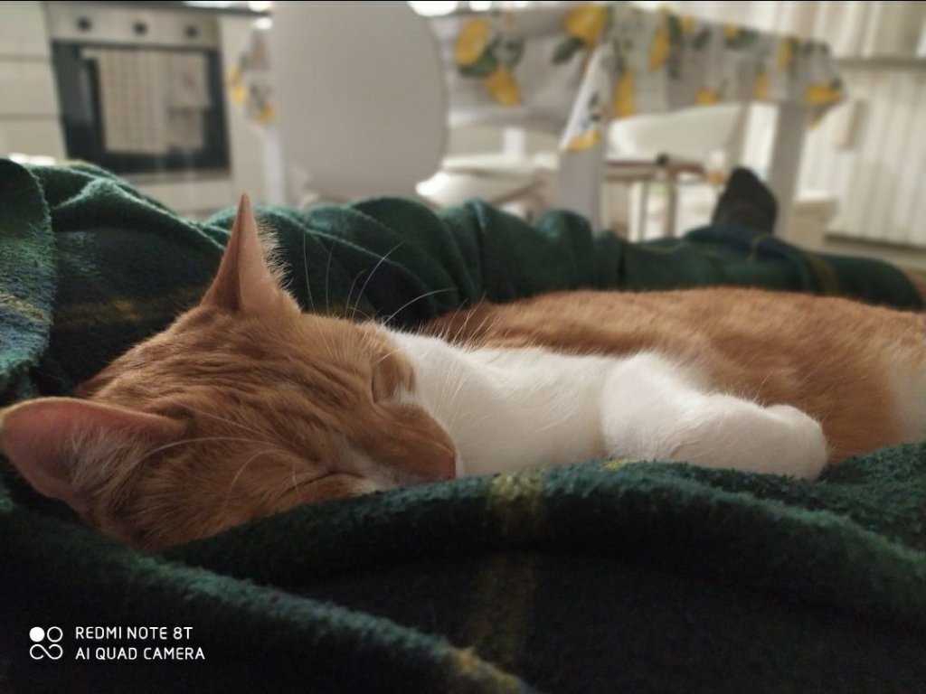 E’ un micio cambiato, nell’aspetto e nel carattere: appena ritorna nell’ambiente che lo aveva ospitato pochi giorni prima dell’adozione si dirige verso la sua copertina, e lì rimane a dormire e a fare fusa per tutto il tempo.