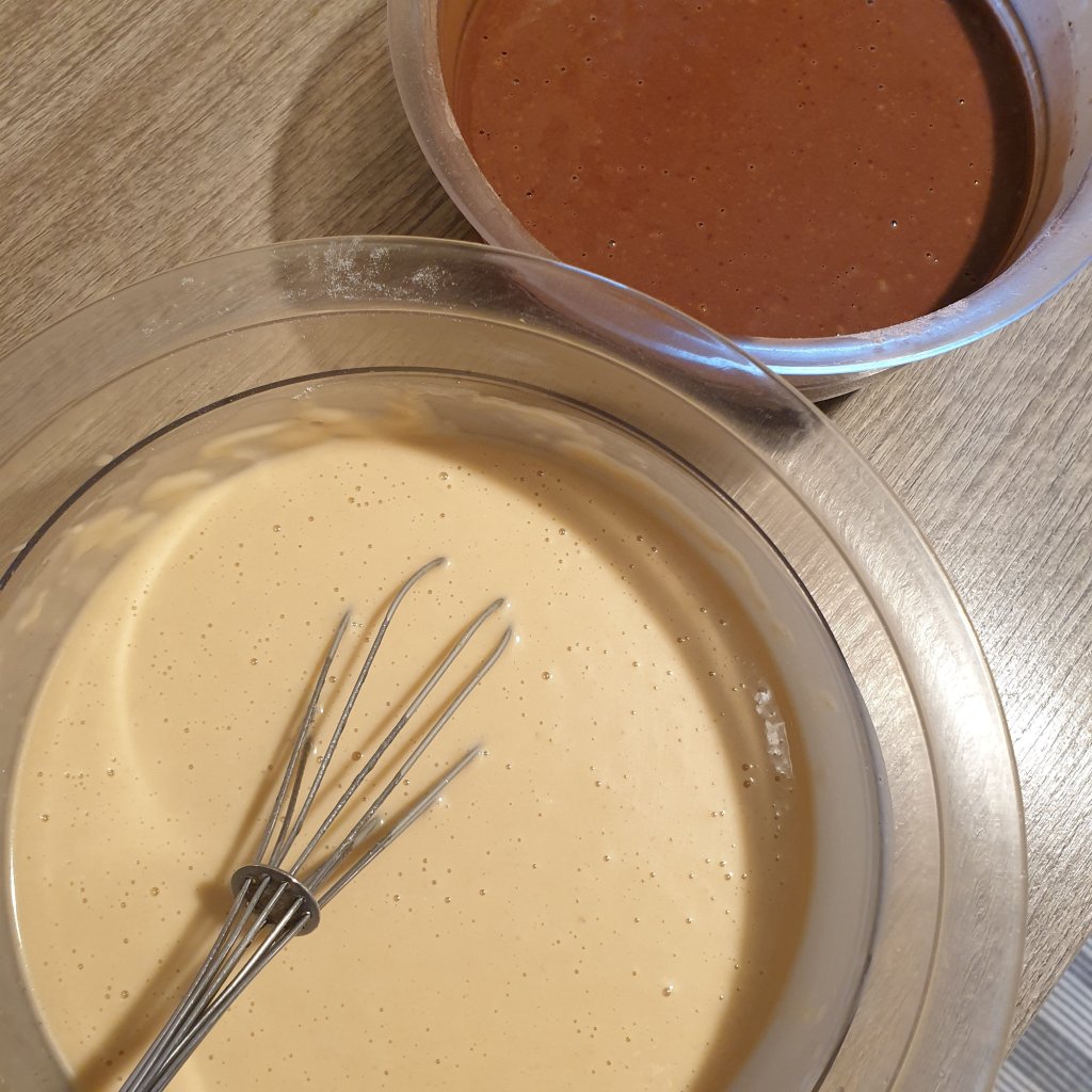 Il risultato deve essere due contenitori con dentro l’impasto al cacao e quello alla vaniglia, entrambi lisci e morbidi.