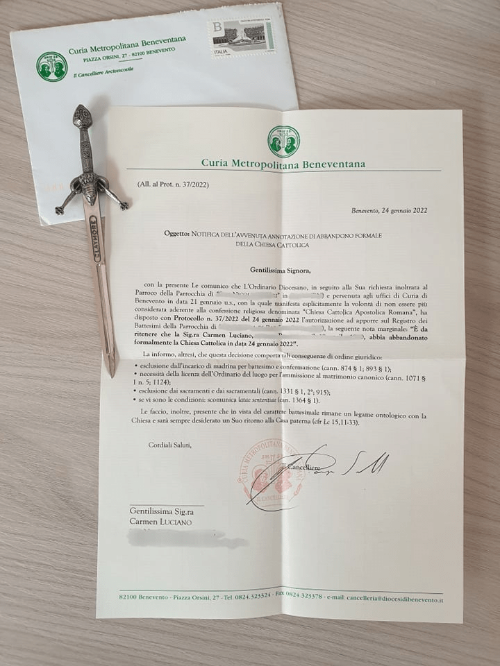 Il documento (che incornicerò con cura) sopra riportato indica al suo interno che dal 24 gennaio del 2022 ho abbandonato formalmente la Chiesa Cattolica Apostolica Romana, e che di conseguenza non posso più essere madrina di chi riceve battesimo, sposarmi in chiesa, ricevere funerale religioso (mai desiderato) e se vi sono le condizioni (chissà) posso ricevere una scomunica latae sententiae. Viene fatto presente anche che un mio eventuale ritorno nella Casa paterna sarà sempre desiderato. Ma non accadrà mai.