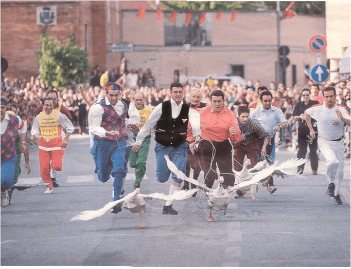 A Lacchiarella (MI) si usano questi animali da ormai 44 anni (deve essere andato qualcosa storto attorno agli anni ’80). Pensate, non la ragione, non il buonsenso, non il rispetto per gli animali ma UNA PANDEMIA era riuscita a interrompere il Palio dell’Oca, che ha ovviamente fatto ritorno. C’è da esserne fieri. La competizione avrà luogo domenica 16 ottobre.