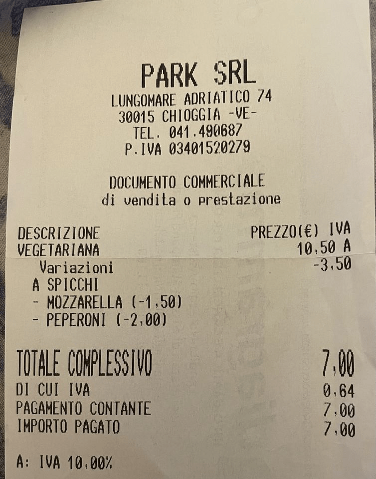 come potete vedere dallo scontrino, al prezzo della pizza sono stati scalati gli ingredienti che lei ha chiesto venissero tolti.