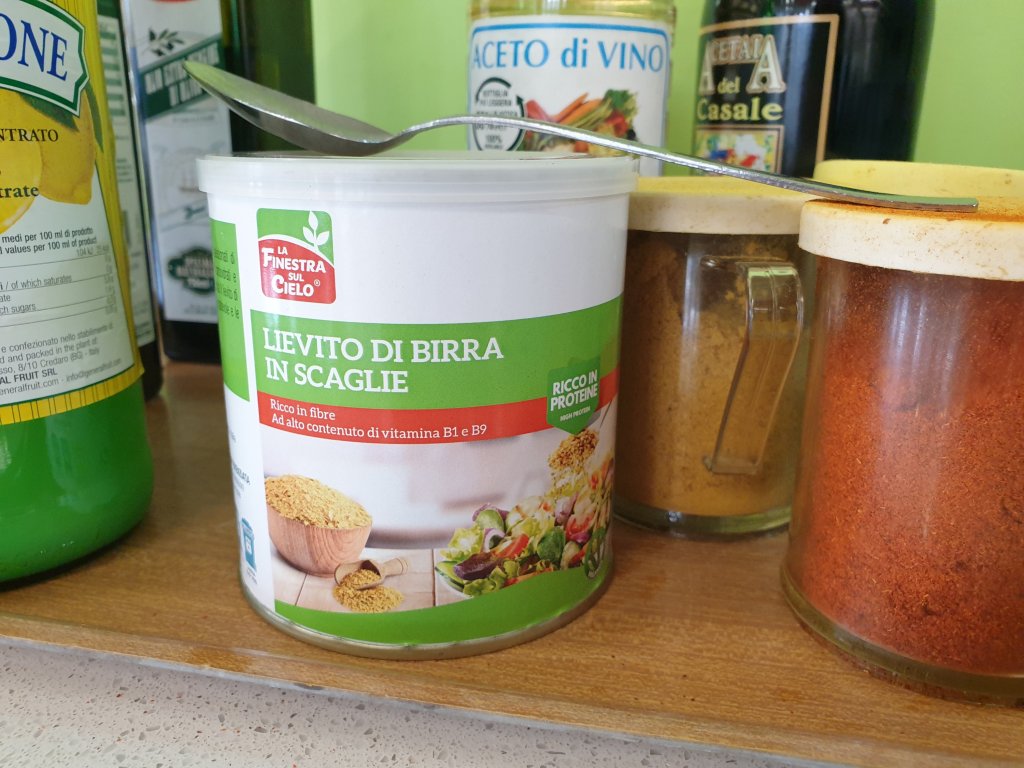Un bel barattolo di lievito alimentare in scaglie per poter arricchire il mio piatto era lì collocato accanto a spezie, olio e limone. Fantastico!