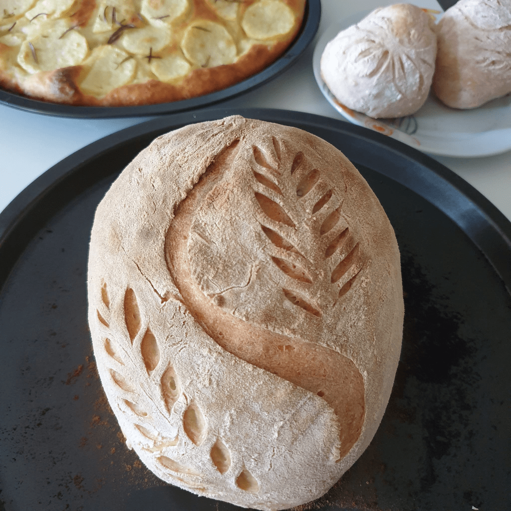 Quando il vostro panetto sarà lievitato, con l’aiuto del taglierino per il pane praticate le incisioni-decorazioni che più vi piacciono. Oppure, potete lasciare l’impasto così com’è. Ma vi assicuro che decorato è veramente una soddisfazione!