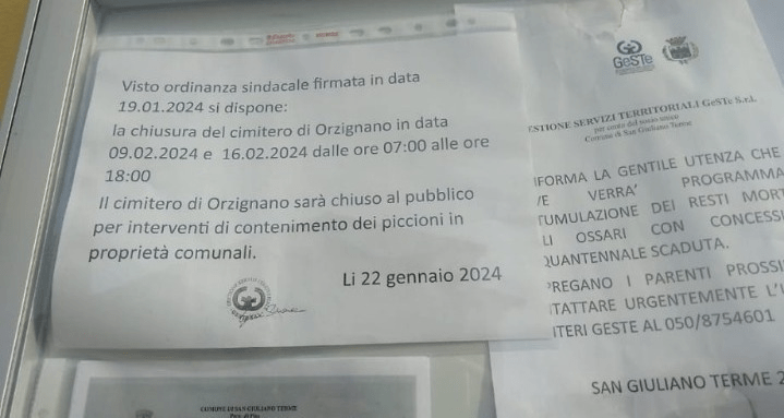 – PisaToday Cimiteri chiusi a San Giuliano Terme per ‘caccia ai piccioni’: “Ordinanza crudele”