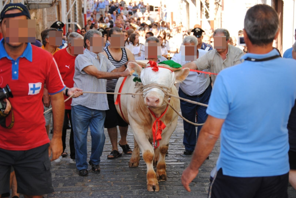 Questa usanza di paese prevedeva l’impiego di un bovino da immolare come capro espiatorio. L’animale, addobbato, legato e bendato, veniva condotto in processione lungo le strade del paese con attorno la folla di attimorati di dio – quelli che pensano che un giorno varcheranno le soglie del paradiso e che il loro signore gli farà un lungo applauso per le loro gesta – per essere sacrificato in onore del santo.