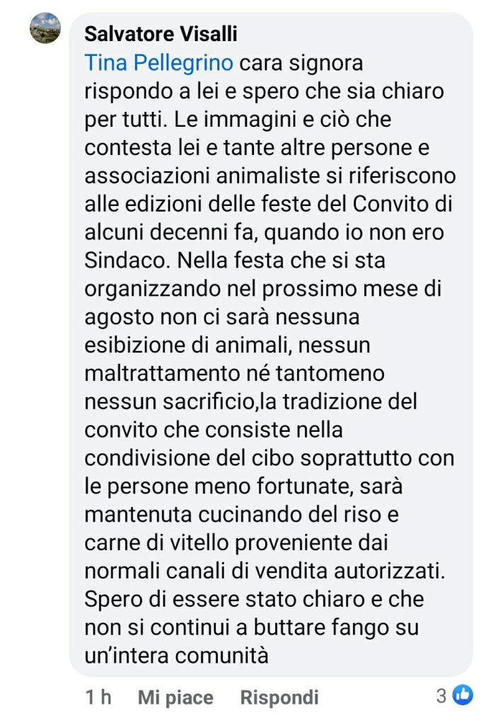 “In relazione alla celebrazione in oggetto, sono pervenute, principalmente da parte di Associazioni animaliste, numerose e-mail indirizzate anche alla S.S., che inopinatamente ed in modo del tutto infondato sostengono che durante la festa del Convito il vitello verrà bastonato, terrorizzato, ornato, bendato, sgozzato e financo macellato. Nel respingere le ingiuriose ed infamanti accuse di maltrattamento animale si rassicura che il redigendo programma del Convito prevede che un vitello, già svezzato, munito dei requisiti richiesti dall’anagrafica veterinaria, sia condotto in una breve sfilata da “Piano Rosario” alla Piazza antistante il “Castello” senza alcun bendaggio e/o ornamento che possa arrecare all’animale un qualsiasi tipo di sofferenza. Il vitello, se le condizioni lo consentiranno, accompagnato da personale di supporto, dovrà percorrere un tragitto di circa 200 metri e per una durata di max trenta minuti. Durante la passeggiata, nel rispetto massimo del benessere animale, il vitello sarà salvaguardato da qualsiasi azione / omissione che possa rappresentare, anche in forma potenziale, maltrattamento, sevizia o strazio (compresi patimenti psicologici). Al termine di questa semplice apparizione, il vitello, mediante idoneo veicolo autorizzato al trasporto animale, ritornerà al luogo di appartenenza. Il programma rituale, per rispettare quanto riportato negli annuari, trattandosi di manifestazione storico culturale risalente al 1780, finanziata anche dalla Regione siciliana, proseguirà nelle giornate successive con un banchetto a base di riso e carne di vitello (comprata presso i normali canali di rivendita quali macellerie e supermercati).
