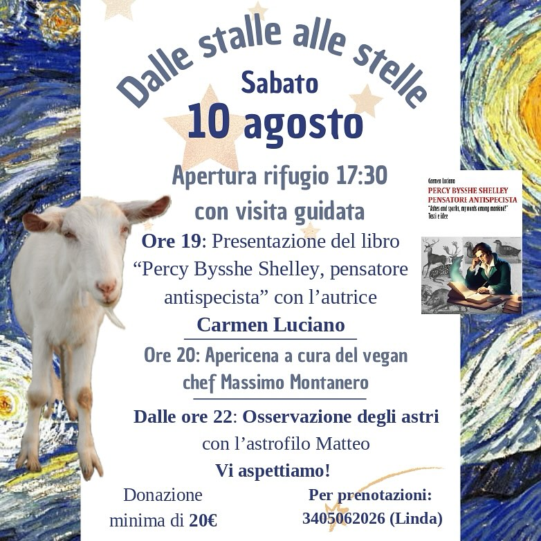 vi informo che sabato 10 agosto 2024 si terrà la primissima presentazione del mio libro “Percy Bysshe Shelley Pensatore Antispecista” in occasione della suggestiva serata “dalle stalle alle stelle” organizzata dal rifugio Ohana Animal Rescue Family ODV di Empoli.