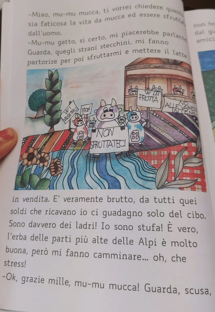 Una ragazzina di 12 anni di Baveno ha infatti composto un racconto in cui un gatto (animale che ad oggi, oggettivamente, gode di maggiore tutela rispetto ad altre specie) intervista altri animali chiedendo loro come vivano. Il testo, che è stato inserito nel Diario poiché vincitore di un concorso ad hoc dedicato a ragazze e ragazzi, porta alla luce come le vacche vengano usate negli allevamenti. In maniera semplice e genuina, attraverso l’esperienza del personaggio, vengono denunciati i trattamenti riservati a questi poveri animali nelle stalle in tutto il mondo.