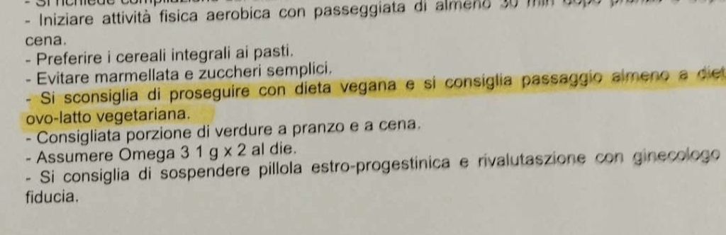 Il medico scrive il referto, che le viene consegnato. Su di esso, nero su bianco, la sentenza: “si sconsiglia di proseguire dieta vegana e si consiglia passaggio almeno a una dieta ovo-latto vegetariana“.