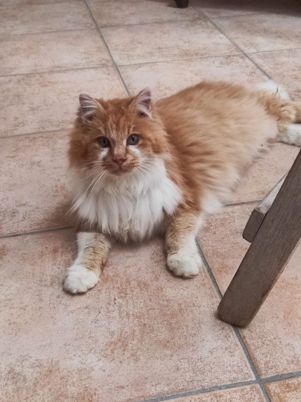 È una femmina a pelo lungo, con pigmentazione bianca e rossa. Ha un musetto bellissimo, zampotte giganti e degli occhi che fanno innamorare. Di carattere è buonissima. Basta una carezza per vederla iniziare a fare le fusa. Ama le coccole, e dormire su superfici confortevoli.