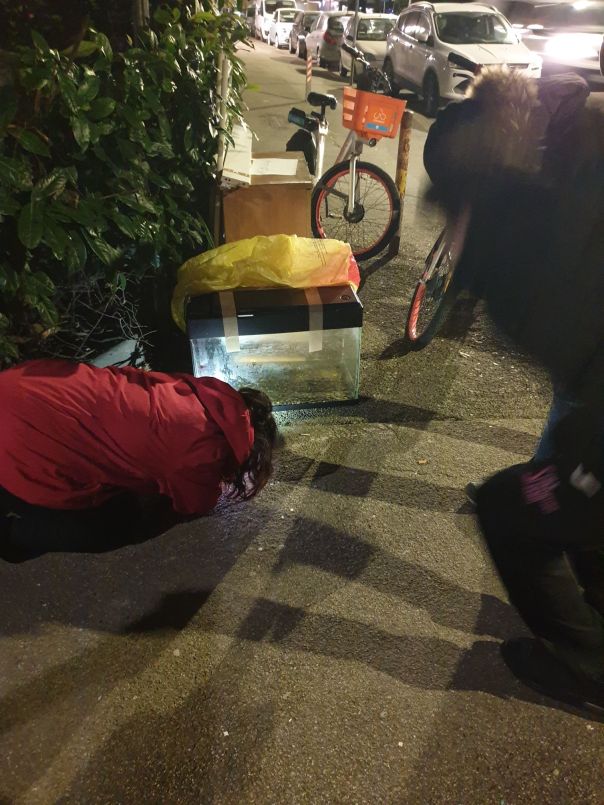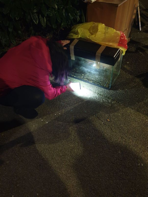 Assieme abbiamo controllato l’acquario: a detta loro, persone in possesso già di altri acquari, all’interno di quello gettato in strada vi erano dei pesciolini Molly, con numerosi esemplari di altra specie.