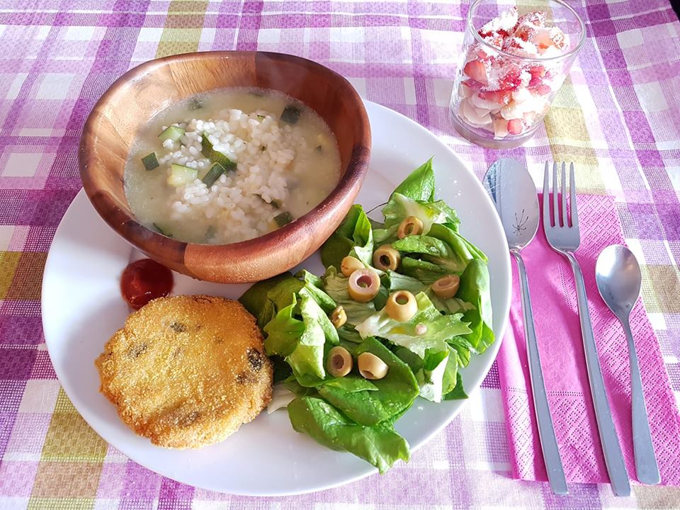 Riso alle zucchine, insalata con olive e cotoletta di soia