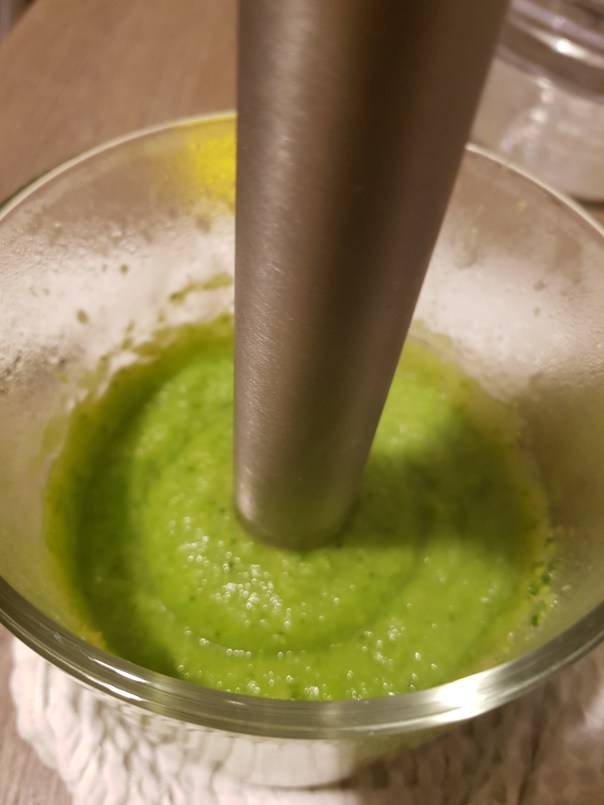 In un recipiente ho inserito le patate ormai cotte e i broccoli. Ho aggiunto un cucchiaino di sale e un bicchiere di acqua. Con l’aiuto di un frullatore a immersione ho frullato tutto. Il risultato è stato un composto fluido di colore verde sgargiante.