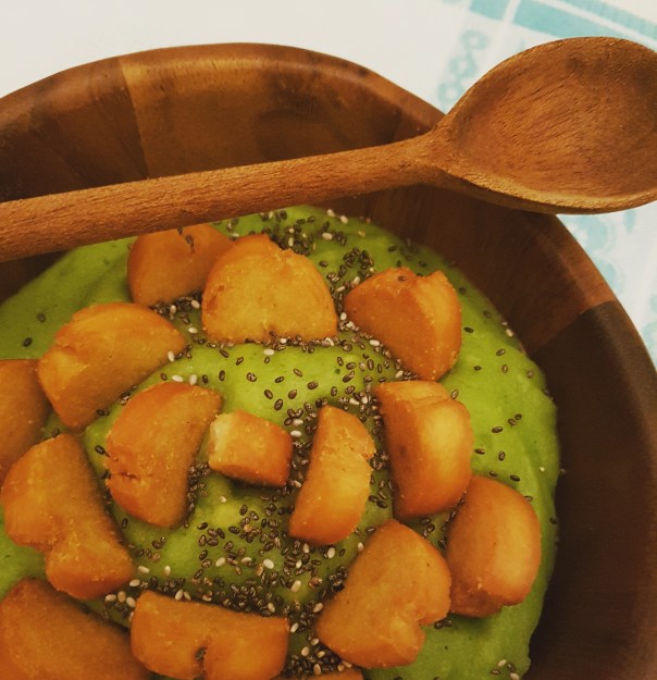 Ed ecco il risultato! Un purè verde sgargiante saporito, con aggiunta di crostini e semi di chia ♡.