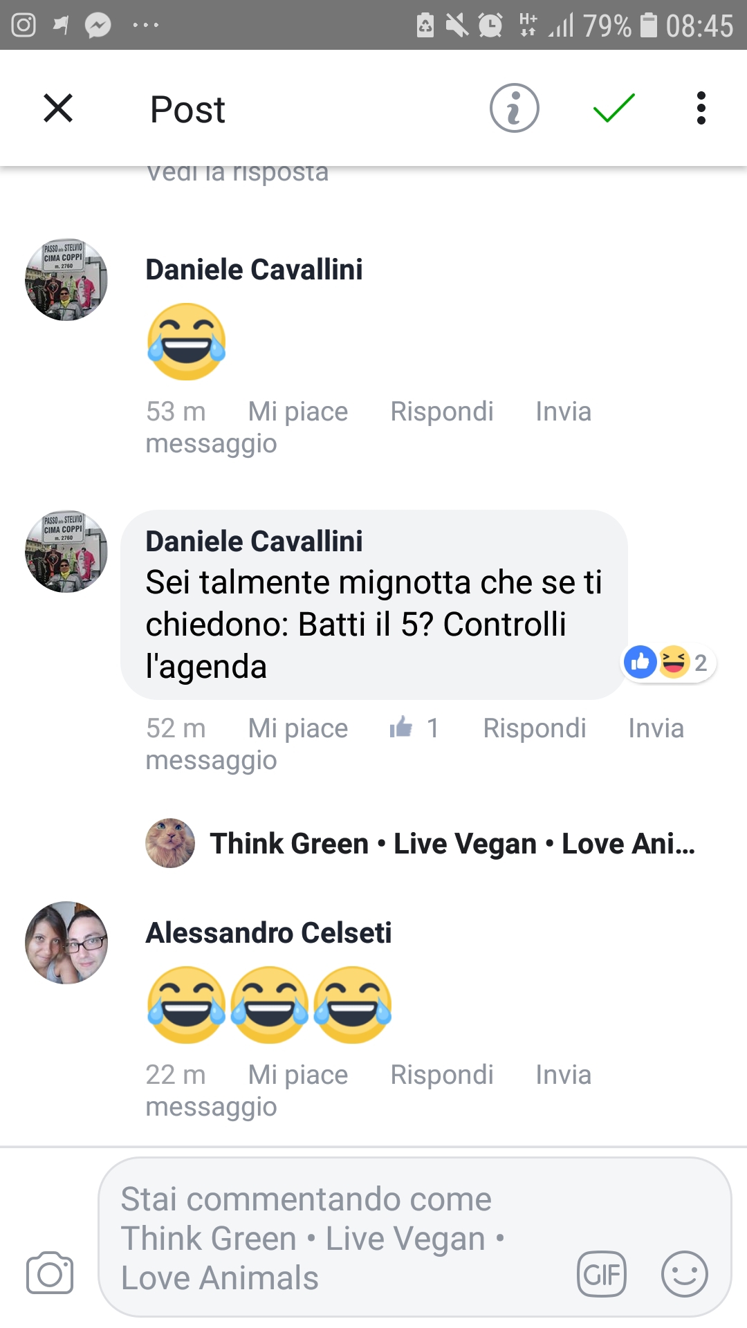 La pubblicazione, nonostante non fosse mirata ad offendere nessuno, non è stata particolarmente apprezzata dagli amministratori di due pagine antivegan che hanno pensato di gettare in pasto ai propri utenti uno screen contenente non solo l’immagine, ma anche la mia foto personale.