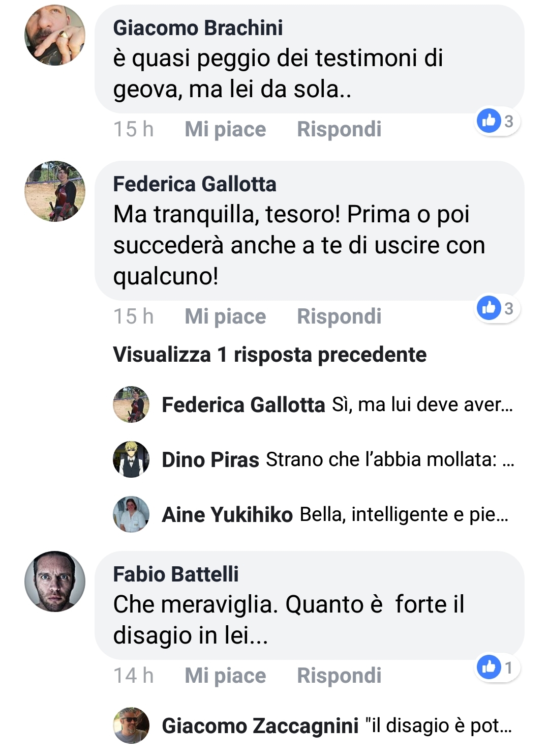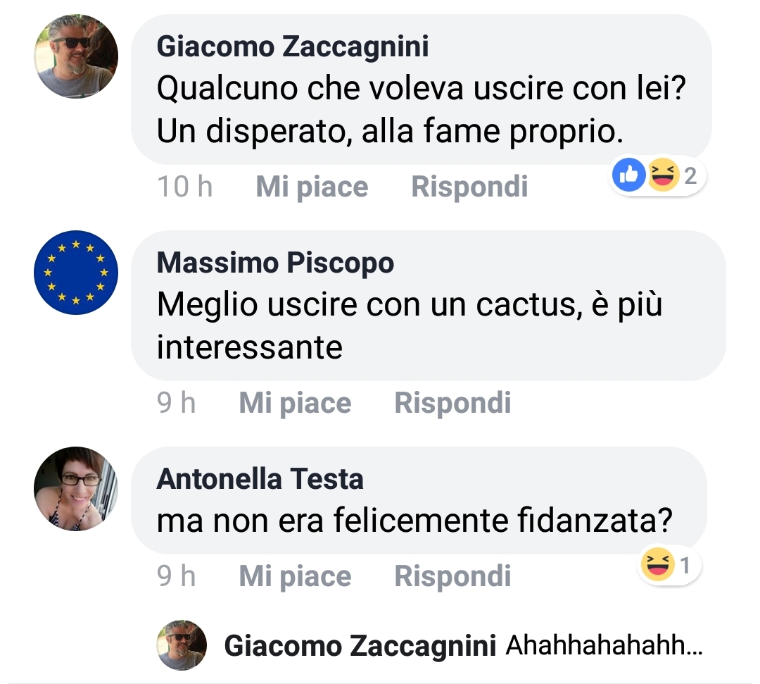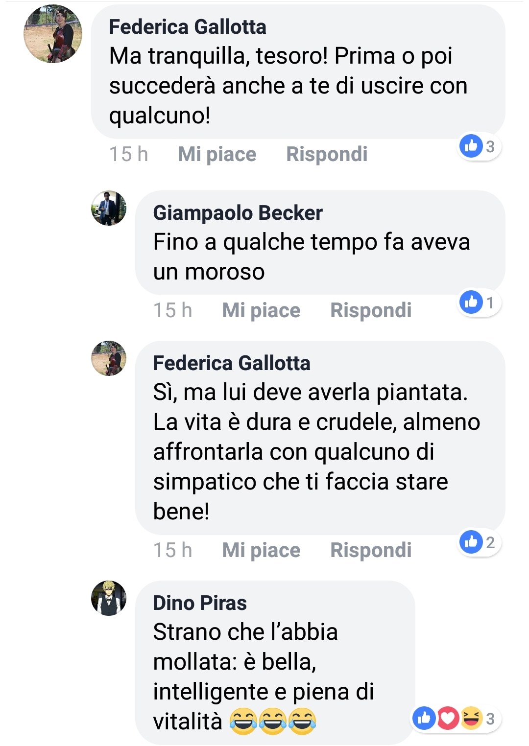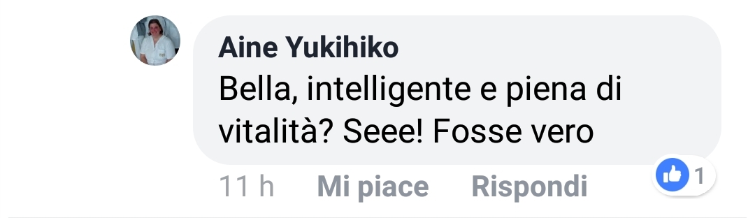 Oltre ad aver notato un familiare “Massimo Piscopo”, punto l’attenzione sul commento sarcastico di Federica Gallotta, cosplayer che già tempo fa esternò la speranza di non incontrarmi mai al Lucca Comix da lei frequentato assiduamente (come se l’evento fosse sua esclusiva e come se a me importasse qualcosa della sua persona).
