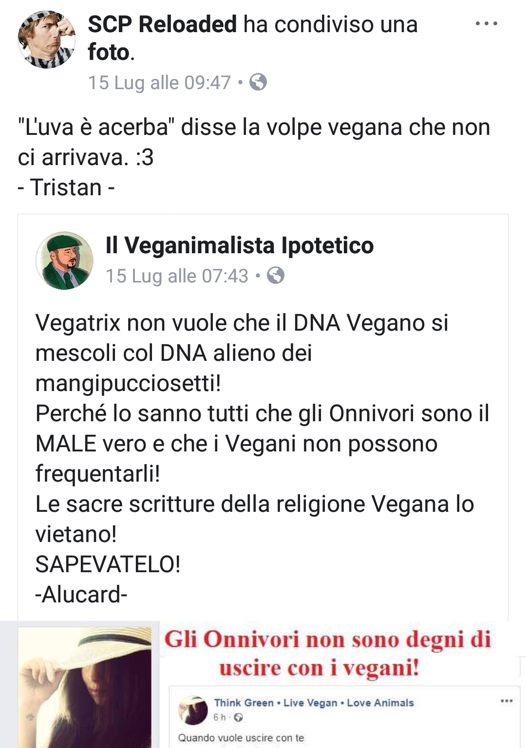Tutto è partito da “Il Veganimalista Ipotetico”, alias “Alucard Draco”, ossia S.G . Non è stato difficile scoprire l’identità dell’admin. Il caso vuole che abiti nella mia stessa città. Però si sa, avanzare critiche dietro un pc è molto più semplice che muoverle di persona.