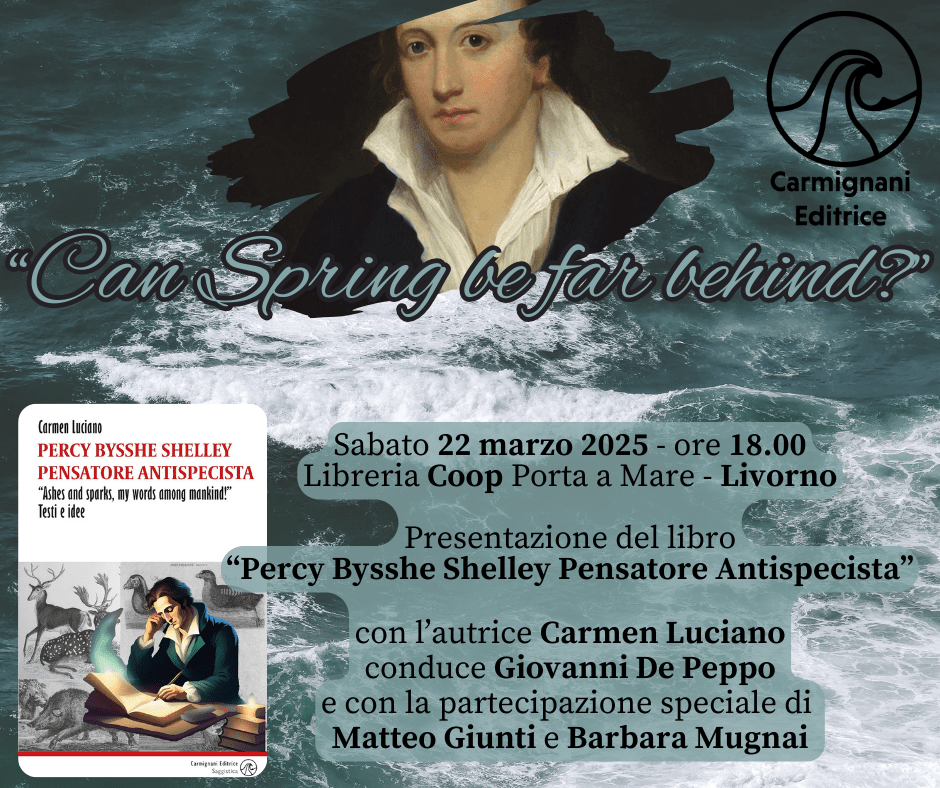 vi informo con molto piacere che il mio saggio “Percy Bysshe Shelley Pensatore Antispecista” edito da Carmignani Editrice è fra le opere che stanno partecipando al concorso di Micro Editoria di Qualità 2025 realizzato a promosso dall’Associazione L’Impronta e dal Sistema Bibliotecario Sud Ovest Bresciano. Tale concorso intende promuovere la cultura e premiare letture di qualità pubblicate da case editrici indipendenti con marchi e riconoscimenti. La premiazione avverrà nel mese di novembre.