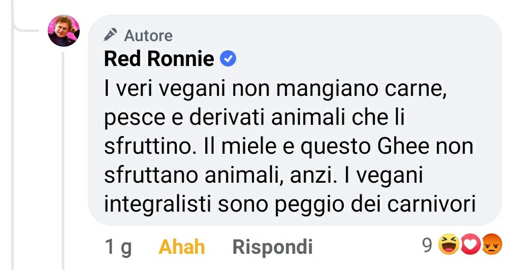 Come era immaginabile (ed auspicabile), Red Ronnie è stato inondato di critiche mosse da persone vegane che difendono gli animali e che non mangiano alcun derivato corporeo delle altre specie. Il post ha raccolto centinaia di commenti lasciati da persone rimaste deluse dal suo promuovere tale alimento, e soprattutto per averlo definito vegan.