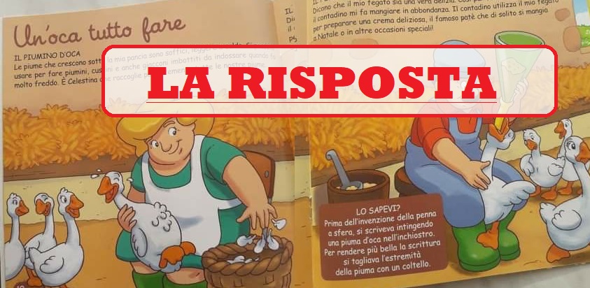 A pagina 12 del libro “L’Oca” si parla della barbara pratica della spiumatura delle oche. Senza la minima vergogna si accenna al fatto che lo strato superficiale di questi animali viene usato per fare piumini, cuscini o giacconi. La contadina Celestina (nome che può avere un perché se si conosce la letteratura spagnola) è raffigurata mentre le raccoglie “pazientemente” mentre l’oca di turno sembra che rida dal solletico mentre altre compagne attendono che tocchi a loro.