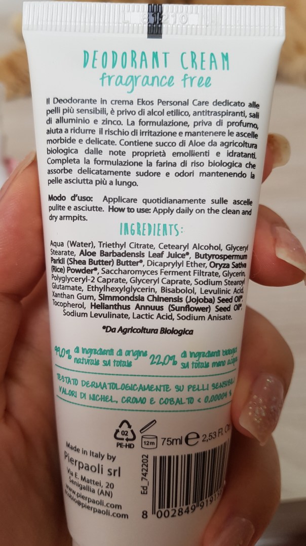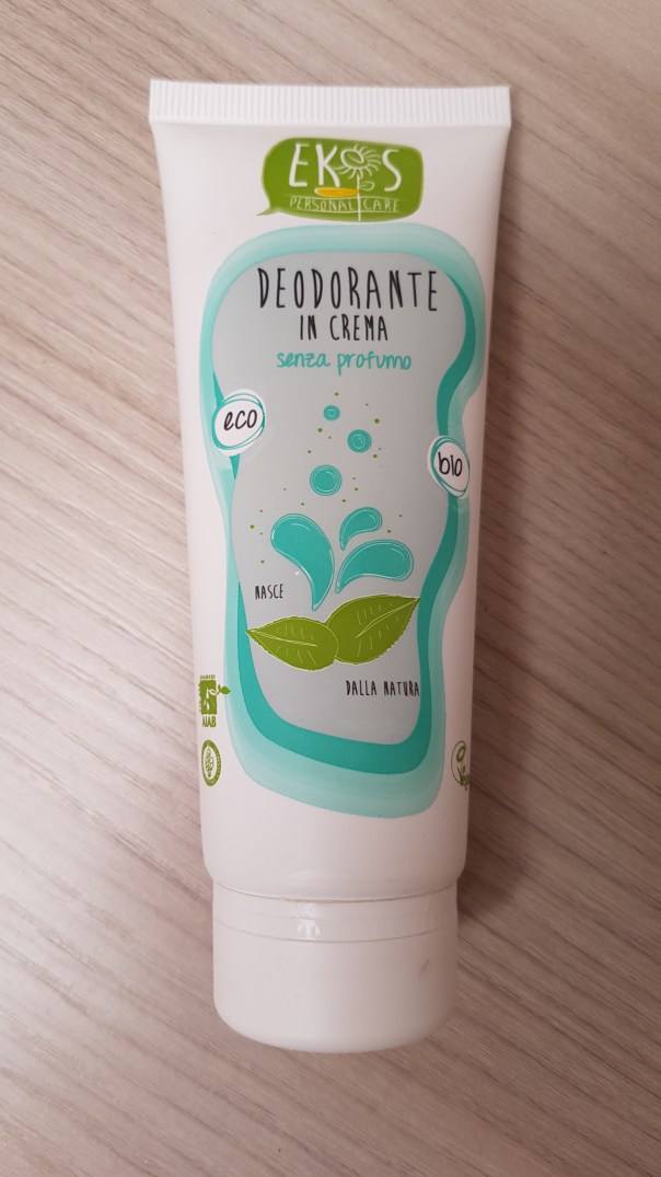 • Deodorante Ekos cremaInsieme allo spray Ekos ho comprato anche questo deodorante crema che promette di non avere profumazione. Dopo averlo stappato ho scoperto con molto stupore che il contenitore è dotato di una estremità arrotondata che serve ad applicare bene il deodorante sulla pelle. E difatti lo fa.Si stende molto bene e lascia la pelle asciutta. Nonostante sia neutro e senza fragranza, questa crema deodora molto. La sua efficacia d’estate lo porta a deodorare fino a 6 ore. Mi è piaciuto e lo riproverò d’autunno.Costo: 3.99 euroEfficacia: 7/10Pregi: pelle asciuttaDifetti: sudando va via la cremaSi acquista nei negozi Tigotà.