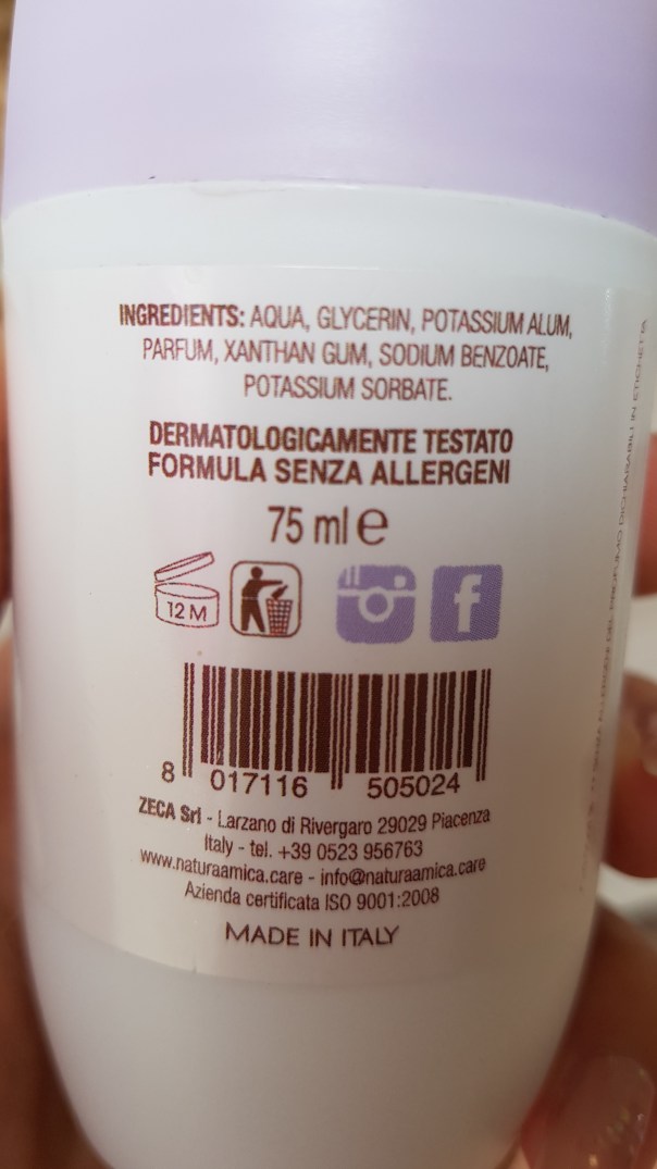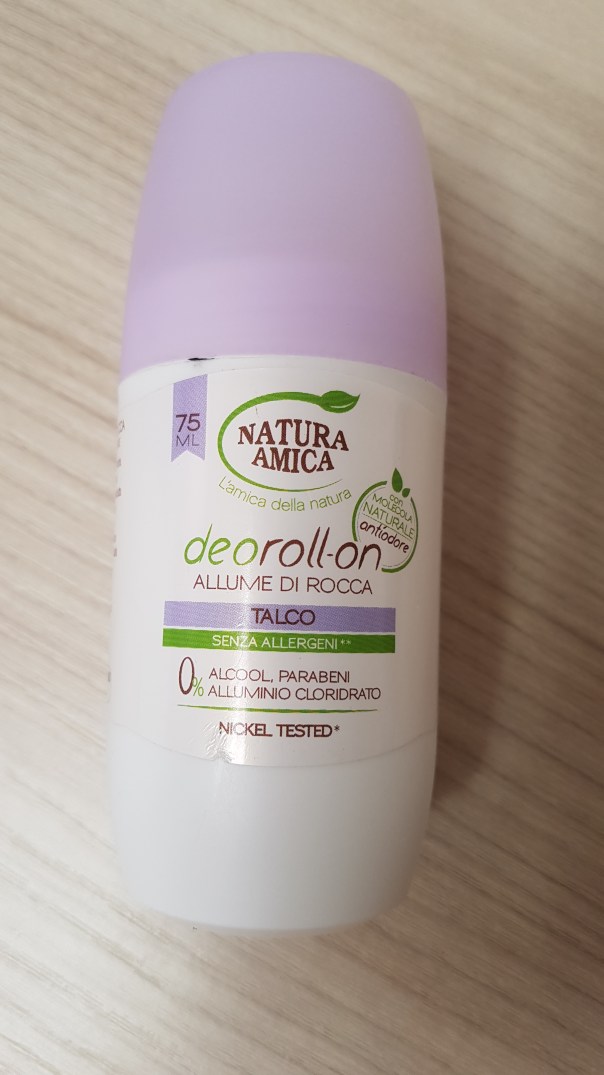 • Deodorante roll on Amica NaturaNonostante abbia pochi ingredienti questo deodorante di Natura Amica funziona efficacemente. Si stende sulla pelle in modo semplice, la lascia asciutta senza appiccicare (anche d’estate) e deodora per oltre 12 ore. L’ho trovato fantastico da usare in vista di attività fisica: nonostante il tanto sudore, nessun odore sgradevole dovuto dai batteri. Dopo 6 mesi dall’apertura il suo potere inizia a diminuire, ovviamente. Rapporto qualità prezzo ottimo. Posso dire sia il mio preferito.Costo: 3.60 euroEfficacia: 9.5/10Pregi: buonissimoDifetti: difficile da reperireLo si può acquistare nei negozi di profumeria o supermercati più forniti.
