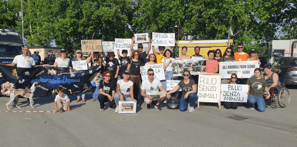 In circa 40 persone fra attiviste e attivisti abbiamo dato voce ai cavalli sfruttati per le gare, ricordando quegli esemplari che sono morti negli anni precedenti tra ipocrisia e indifferenza: Rexy e Ugo Ricotta nel 2021, Ora Basta nel 2014. Ma la lista di animali deceduti a causa del palio non è ben definita e potrebbero esserci altre vittime.