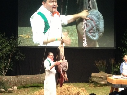 Il macellaio si è esibito in una dimostrazione pratica alquanto barbara di come si estraggono le interiora di un maiale facendone posizionare uno precedentemente ucciso, agganciato per una zampa.