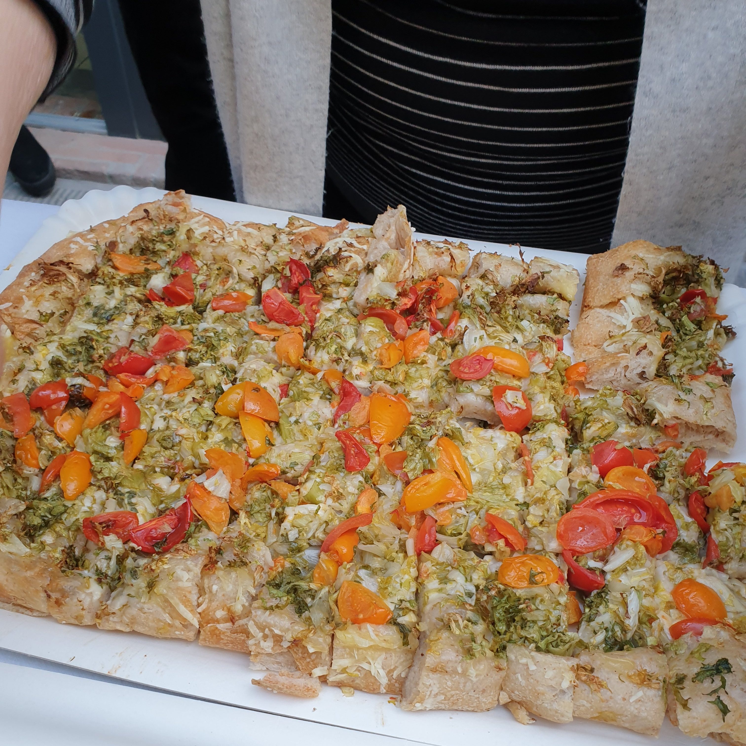 i pitoni caldi, ossia la pasta fritta ripiena, erano davvero fragranti e squisiti. Gli arancini buonissimi, come ne ho assaggiati solo una volta proprio in Sicilia. Le focacce davvero saporite, con i loro pomodorini freschi e altri ingredienti dall’aroma delicato. Non da meno poi il dolce: una favolosa colomba vegana (che sarà disponibile in più versioni in occasione della Pasqua) dall’impasto agrumato e soffice, impreziosita da pezzetti d’arancia candita e pepite di cioccolato. Un sapore squisitamente avvolgente.