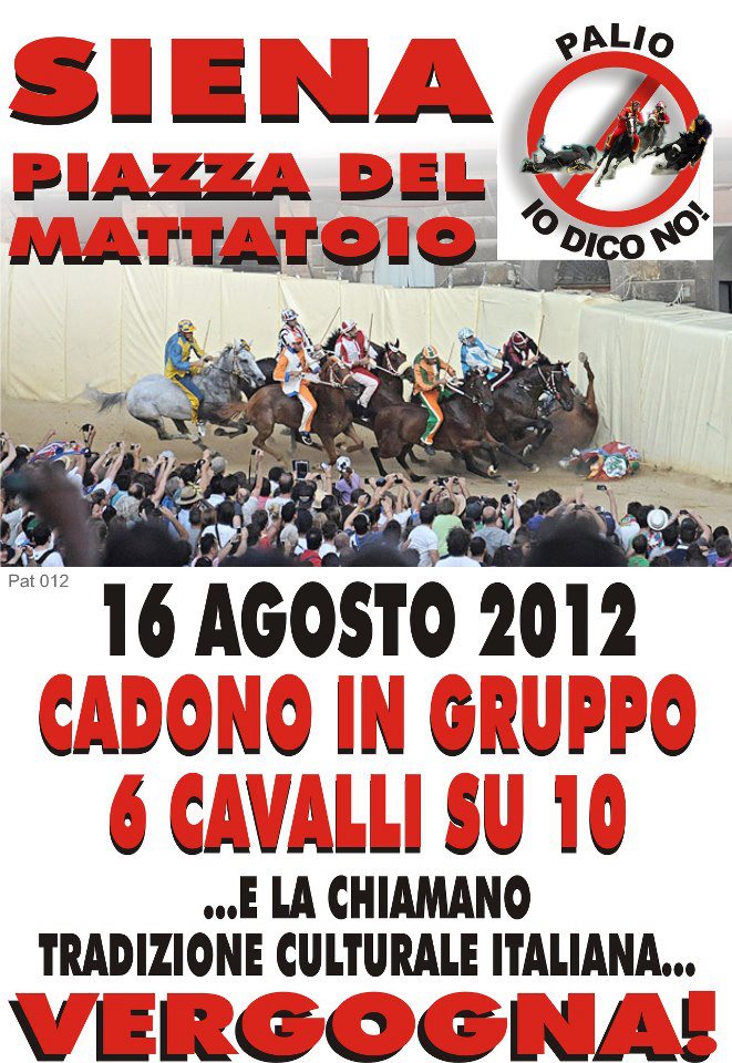 Siamo stanchi e stanche di vedere cavalli scivolare, ferirsi, spezzarsi le ossa del collo, delle zampe mentre degli uomini li sovrastano con una frusta in mano. Frusta realizzata in pene di vitello essiccato, come indicato sul sito ilpalio.siena.it: una duplice vergogna.
