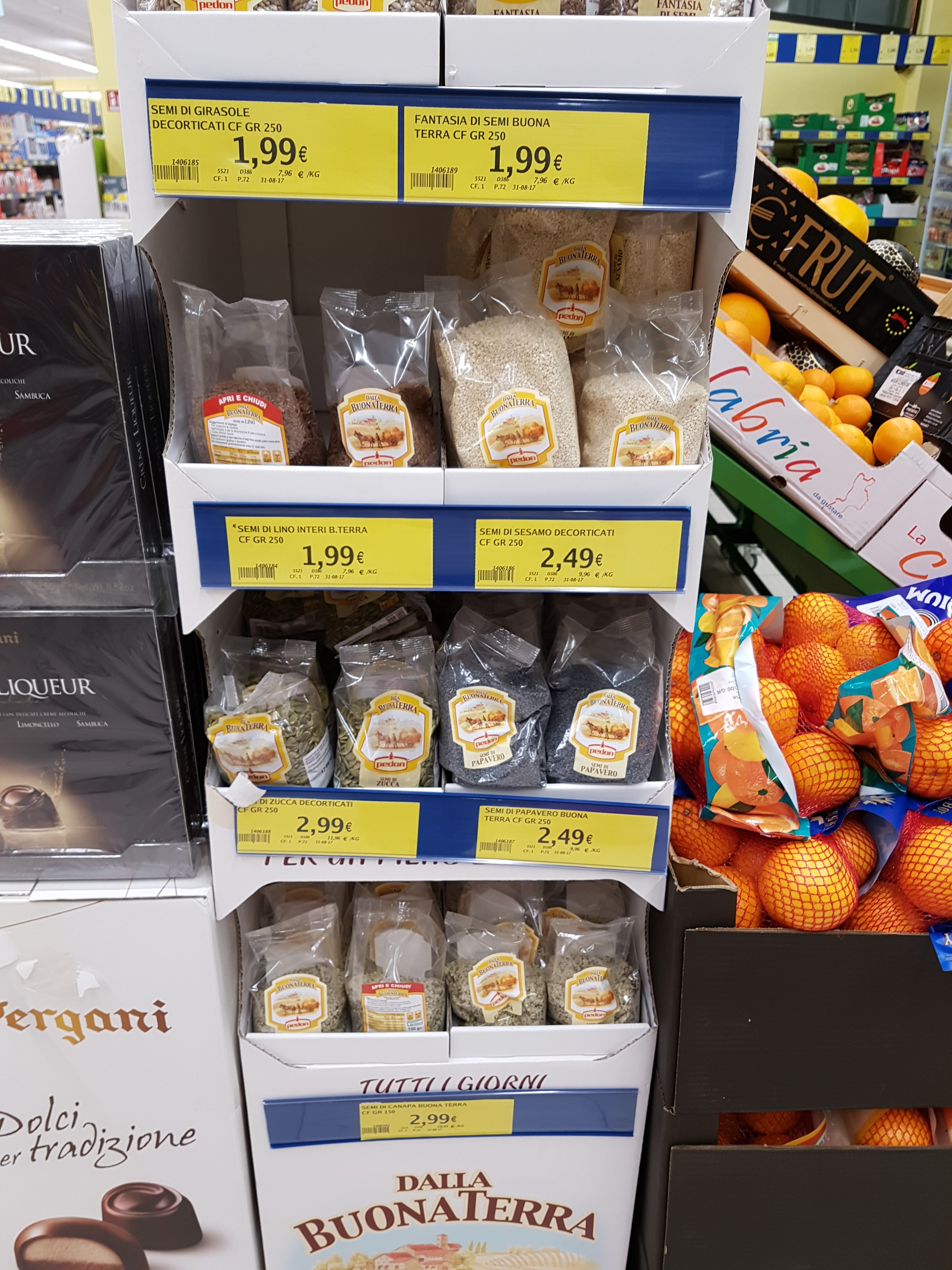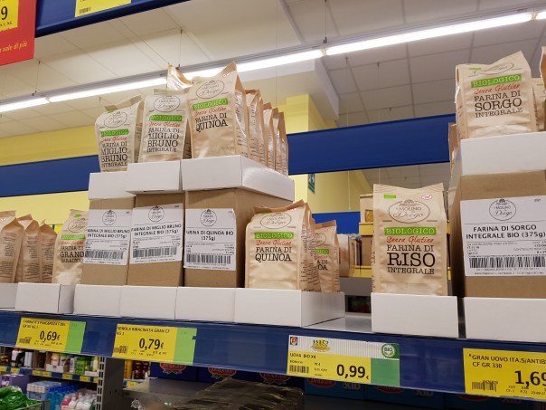 Il reparto farine l’ho trovato davvero grande e ben fornito di tanti tipi di farina diversi: di maranto, riso, grano tenero ecc. Alcune integrali, altre più raffinate (tipo “00”).