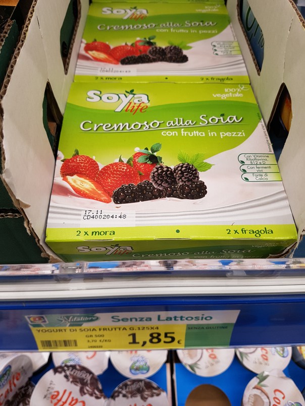 In alcuni banchi frigo si trovano anche gli yogurt di soya con pezzi di frutta della linea “SoyaLife” dal costo di 1,89 Euro (4 pezzi).