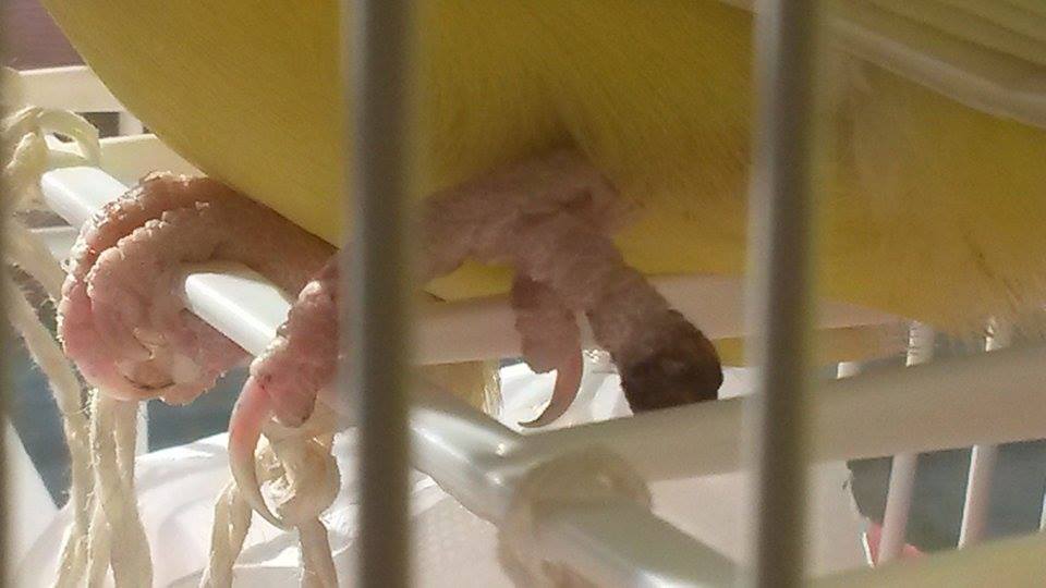 Un dito in necrosi e una ferita alla nuca (anche questa infetta) che sembrava un tumore.In zona non c’erano veterinari aviari e con le mie forze dovetti curarla da sola.