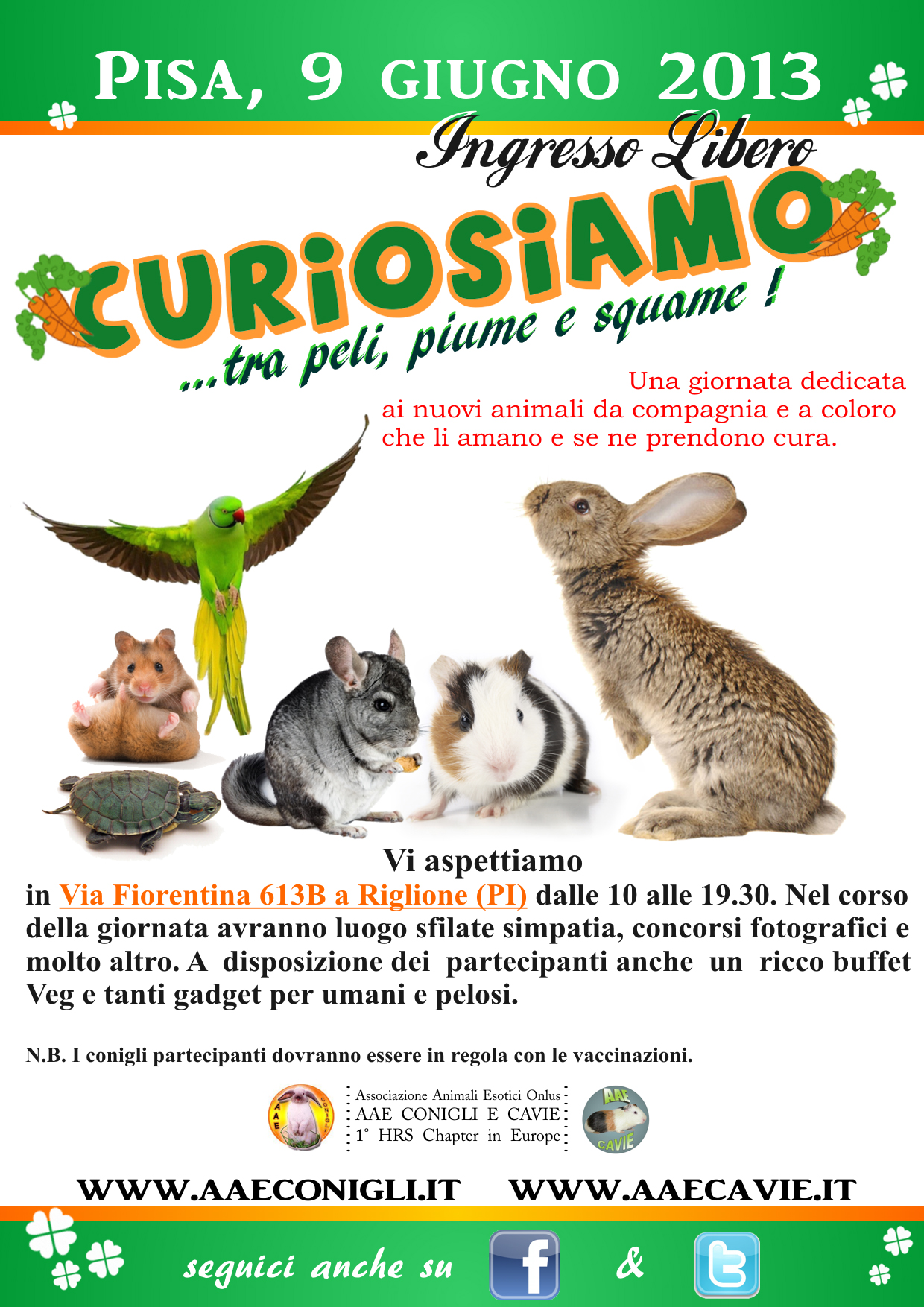 Dopo il grande successo di Conigliando 2013, svoltosi a Ferrara il 5 maggio scorso, ho il piacere di annunciarti un nuovo appuntamento dedicato agli animali cosiddetti non convenzionali, in particolare ai Conigli e ai Piccoli Roditori: Curiosiamo… tra peli piume e squame.