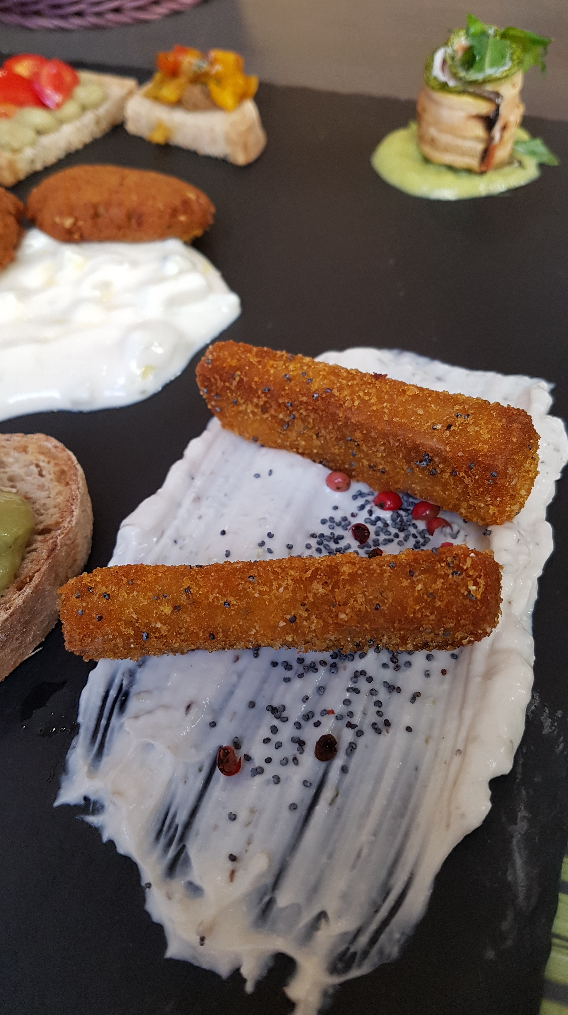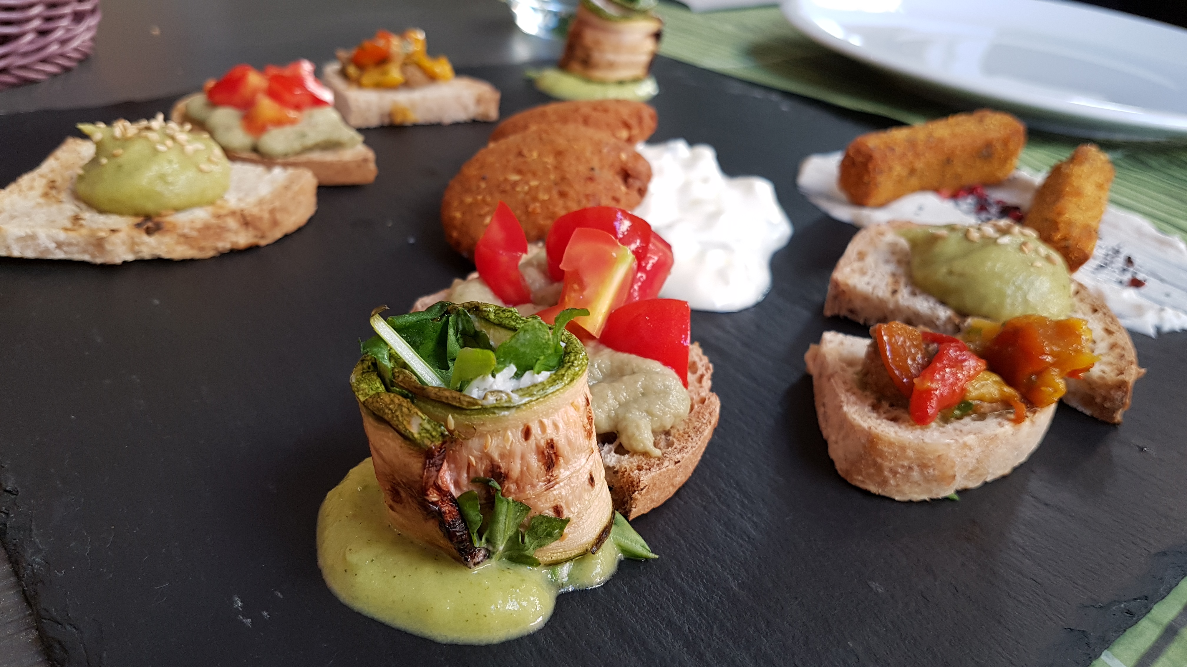 La portata è arrivata in tavola servita su una lastra minerale. Su di essa erano collocati in modo molto accurato un tris di bruschette, zucchine con mopur, crocchette e tofu impanato con semi di papavero e pepe rosa.