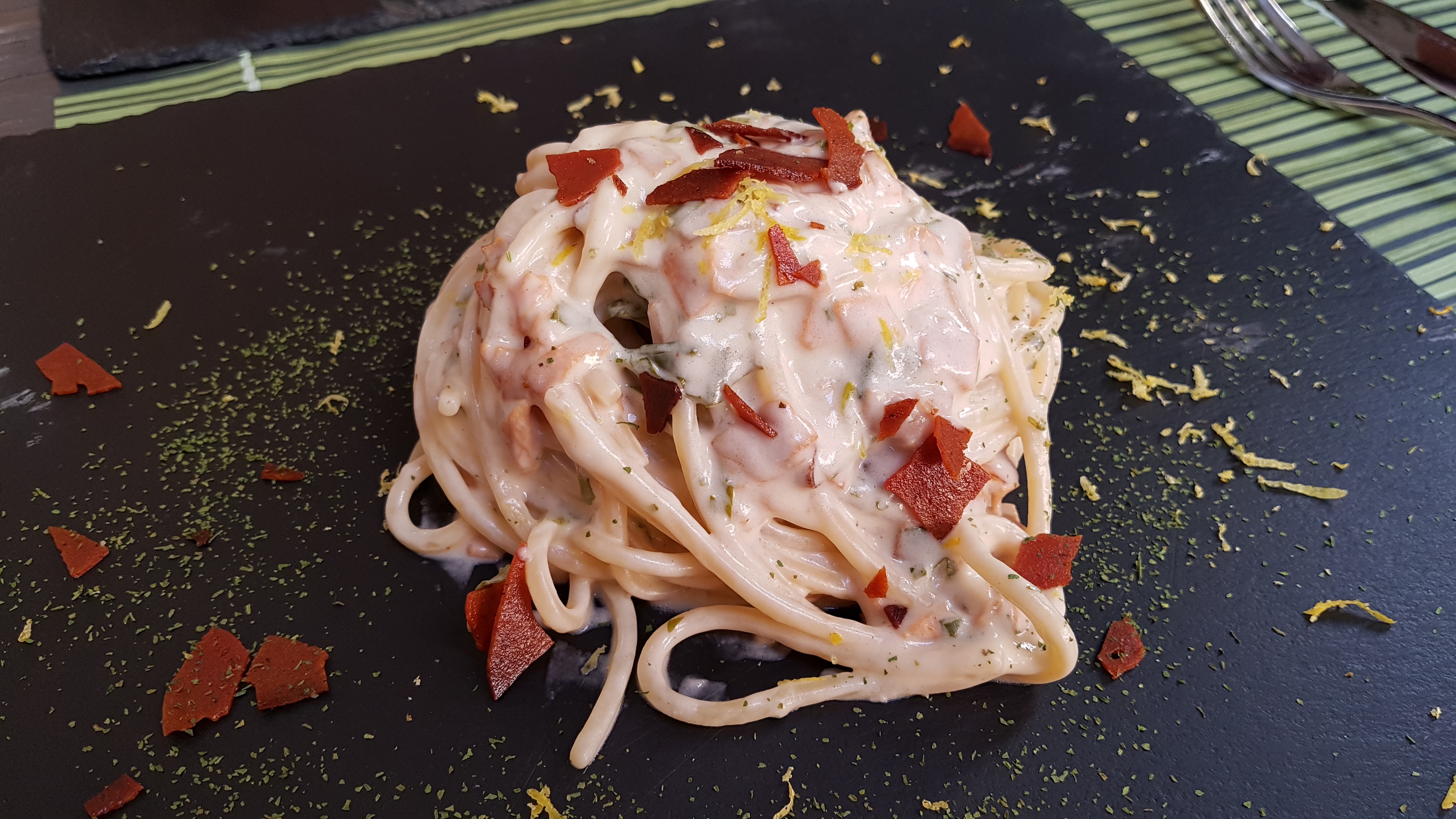 Ho assaggiato per curiosità la pasta, e l’ho trovata molto buona. Poi, mi sono gustata i miei spaghetti al limone: deliziosi! Cotti in modo perfetto, insaporiti da una crema saporita dall’aroma esaltato dalle scorzette grattugiate di limone fresco.